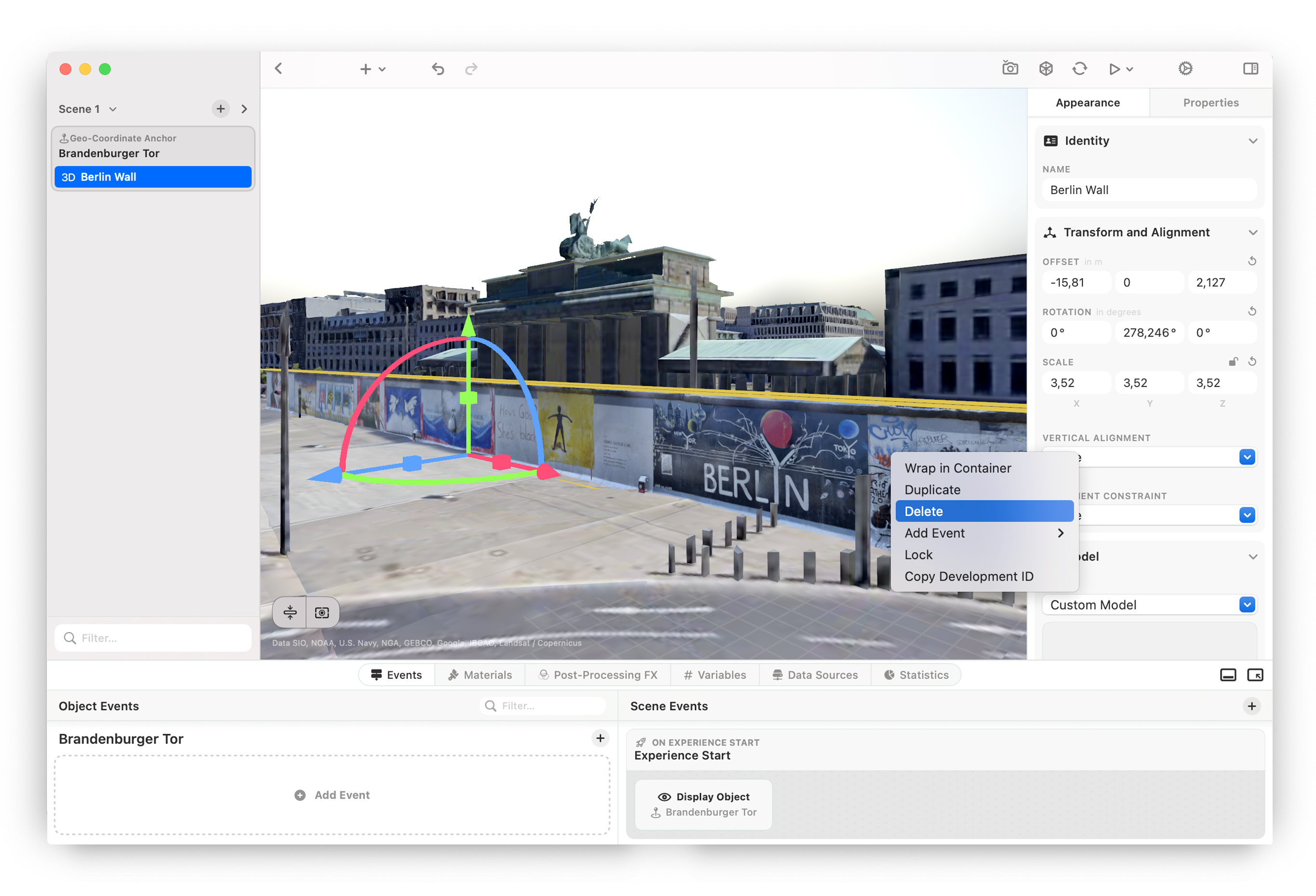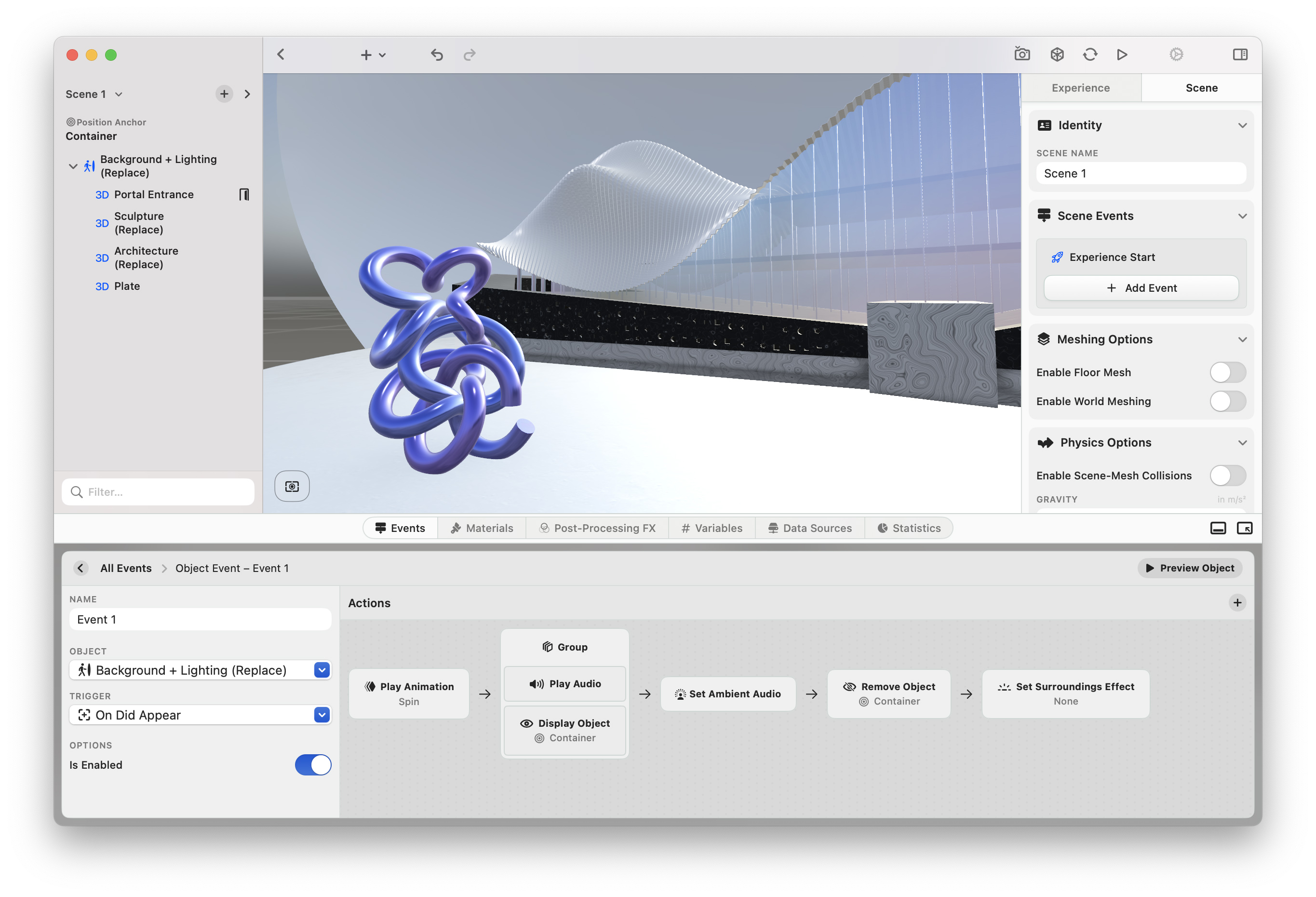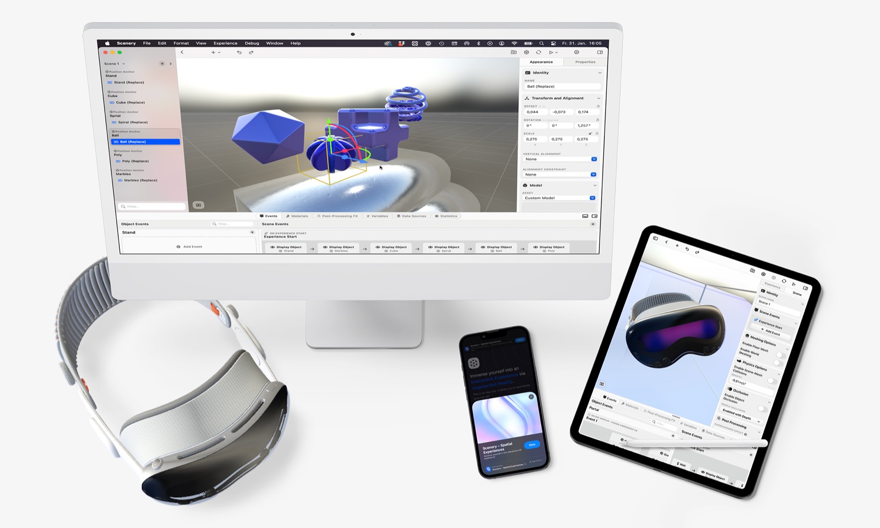 In the realm of Spatial Computing and mobile Augmented Reality (AR), there have always been invisible walls between imagination and reality. These walls take many shapes and forms. We're not living in a world of lightweight, all-day battery life AR glasses yet, so our entry points to immersive experiences are mobile phones and virtual- and mixed-reality headsets with high-quality cameras and even higher-resolution screens, like the Apple Vision Pro. That being said, although these devices and their ability to understand the world around them can surely be described as engineering pieces of art — it still takes a lot of good design experience to make people forget they are holding up a phone or wearing a big piece of hardware on their forehead. Another manifestation of these walls is the gap between what creators, brands, and creative studios envision and what they can actually build. Experience design and development for immersive platforms can be a maze to navigate, requiring years of expertise. Today, and in the true fashion of a Berlin-based company, we follow Reagan's famous call. We want to tear down some walls. In our case, with Scenery, the XR creation and distribution tool that transforms how we build immersive experiences for Apple Vision Pro, Mobile AR, and beyond. The promise of spatial computing has always been about breaking down the barriers between digital and physical reality. Yet for too long, that promise has been constrained by tools that limit rather than liberate creativity. Our journey began with a simple but powerful idea back in late 2018: location-based Augmented Reality scavenger hunts on your iPhone, powered by Apple's newly released ARKit — the perfect foundation to build on. There's a reason why AR scavenger hunts are among the most common use cases in the mobile AR space. If done right, they just work. The reason why is simple: context. If you're already facing the problem of constantly holding up a phone to embark on a digital experience, context is what pulls you in. The moment your virtual content starts interacting with your physical surroundings is the moment you stop watching and start being part of a story. In addition to our context-ingredient, we wanted to empower creators from Day-1 to build AR experiences, which resulted in our first app — Scavengar. An AR scavenger hunt app that enables the average Joe to build and share location-based AR scavenger hunts easily and straight from their iPhone. We started this side-project out of pure passion and curiosity and knew we were onto something when the first brand that reached out to us was Apple. Over the years 2020–2023, our AR app evolved steadily, we grew as a team along the way, and started building a business on the solid foundation we had laid, always following the road of excitement for the technology and how it enabled creators to tell stories in new formats. Alongside our evolution, we wanted to break free of the linear storytelling and the gamification-driven nature of scavenger hunts. We wanted to expand the feature set of Scavengar to better reflect non-linear immersive experiences, often driven by collaborations with digital artists and cultural institutions who were interested in rethinking traditional storytelling methods. We knew our vision evolved, and it was time to listen. We've been working alongside the biggest entertainment and luxury brands, award-winning agencies, and sought-after creative studios. Scenery came into existence as a solution to the industry's biggest challenges, which we'd like to shine some light on below. As in many industries, there's a lot of challenges to overcome and problems to solve. However, having worked in the XR space since 2016, and talking to, pitching with, and building for close to 700 brands, studios, and creatives, we identified patterns which came up reliably. When creating immersive experiences, you currently have to make one big decision. Either you focus on the best quality possible, build with traditional game engines like Unity or Unreal, and develop a comprehensive app which users need to install on their devices; or you go with web-based solutions like 8th Wall which are very accessible across devices but lack a lot of quality, therefore immersion. While WebAR promises accessibility, it shows significant limitations, specifically on iOS. As users need to go through the browser, powerful frameworks like WebXR and three.js can't perform at their best, as they don't get access to all the device performance, sensor data, etc. This results in a much worse quality compared to native app solutions, and the AR experiences are often perceived as a gimmick which does not do justice to the potential of this beautiful medium. On top, the only serious solution out there, 8th Wall, charges hefty monthly fees for commercial licenses, on top of the development budget you need to build the actual experience. The creative industry faces a critical disconnect. Fake-Out-of-Home (FOOH) projects which have been flooding social media in recent years lead to sky-high expectations in terms of quality, while the expectation for the cost of true (actually working) XR projects sits at the very other side of the spectrum. We're seeing an average budget of around 50,000 USD and an expected turn-around of 6–8 weeks. Most of the time when building everything from scratch, both do not get your idea to where it needs to go to meet expectations. This leads once again to the common opinion that XR and AR, in particular, are gimmicks which don't convert and provide a proper ROI. If you're ready to properly dive into the world of XR development, you probably must embark on the journey of learning how to code, even with AI. Your game engines of choice will most likely be Unity or Unreal Engine, which come with a great set of features but very steep and long learning curves. Ultimately, many platforms like Apple Vision Pro are just partly or not at all supported, and y